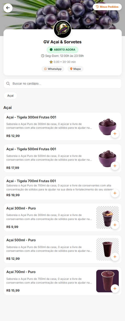 ● Cardápio Digital: Gestão de produtos, categorias, fotos e adicionais (borda